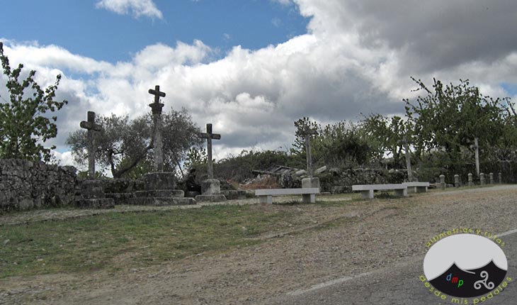 Este primer kilómetro es muy suave, y en seguida se aprecia, allá, arriba las primeras casas del pueblo, pero antes de llegar a el debemos aun recorrer un par de kilómetros, acercándonos primero a un esplendido mirador hacia el río Francia, y toda esta zona de la Sierra, y luego, justo antes del pueblo, los cruceros, ya que son varios, el Vía Crucis, a la izquierda de la carretera.