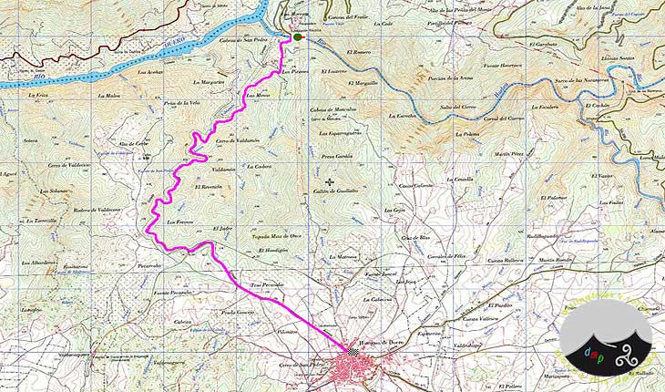 Para iniciar la subida nos vamos a situar en la presa de Saucelle, dejándola a nuestras espaldas. En la carretera DSA-590, que es sobre la que nos encontramos, nada mas abandonar la presa vamos a encontrarnos un cruce, a mano izquierda hacia Saucelle, y recto hacia el poblado de Iberdrola e Hinojosa. Seguiremos rectos, por tanto, y una vez superado el poblado de Iberdrola, hoy espacio de turismo rural, Aldeaduero, en el mismo puente sobre el río Huebra comienza la subida.