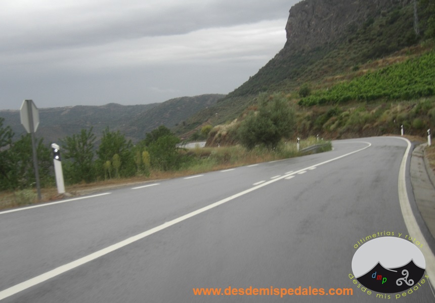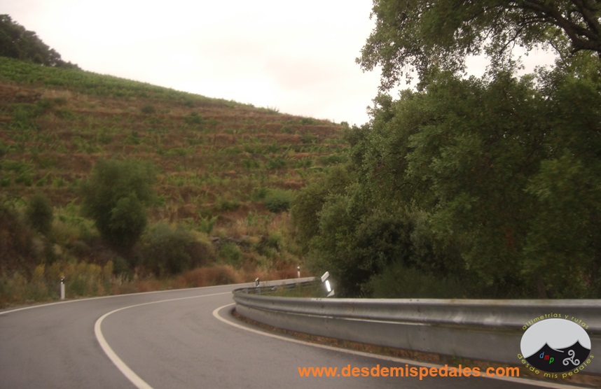 Seguimos pues hacia Freixo de Espada á Cinta ya por la N221, y en estos dos kilómetros siguientes notaremos lo que deciamos en el párrafo anterior: es una carretera para disfrutar. Ha bajado la pendiente, la carretera está muy bien trazada, el clima es muy benévolo en cualquier época del año y los viñedos de las numerosas Quintas que hay por aquí nos van a hacer disfrutar mucho. Pero no nos confiemos. Cuando llegamos a una amplísima curva de vaguada, y topamos de bruces con una larga recta, la cosa vuelve a cambiar. Varias rampas del diez por ciento para completar un kilómetro al 8,2% nos devuelven a la realidad del sufrimiento sobre la bici. El sufrimiento del disfrute. Una vez hemos superado este duro kilómetro, suaviza un poquito el porcentaje, pero aun nos quedan novecientos metros para concluir la subida. Ésta concluye unos centenares de metros antes de llegar al pueblo, en el cruce que hay junto al campo de fútbol de la localidad.